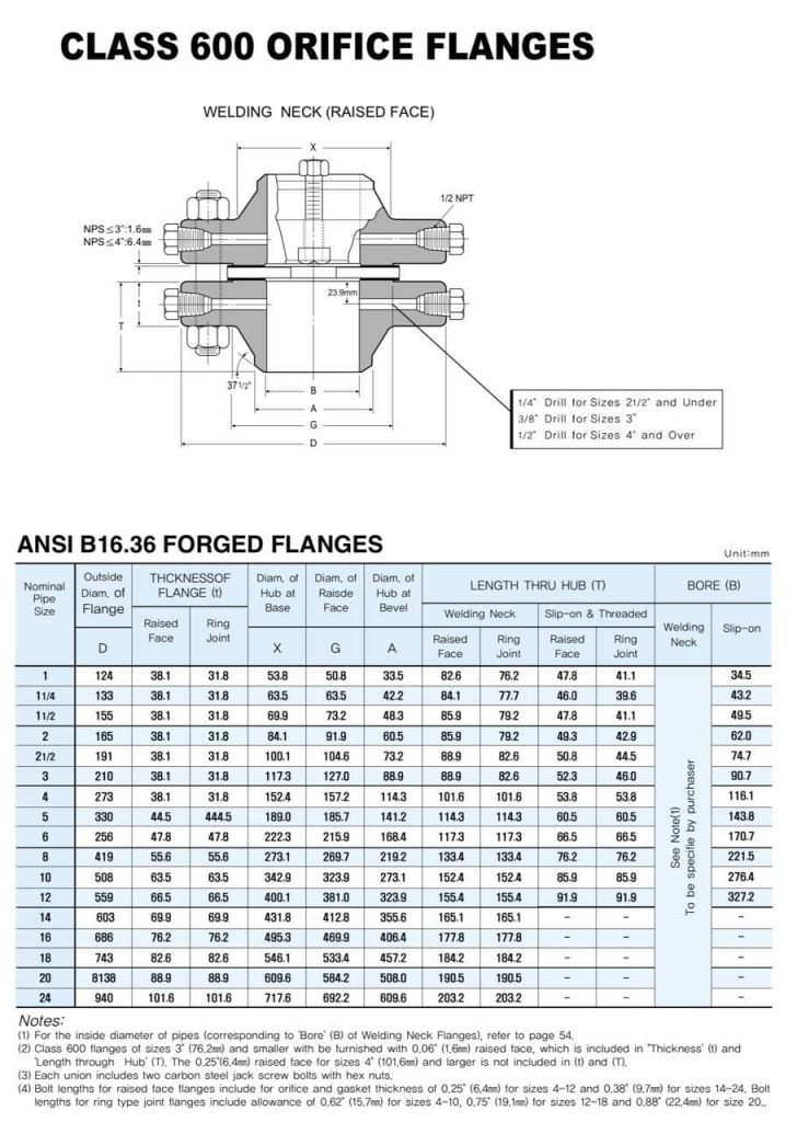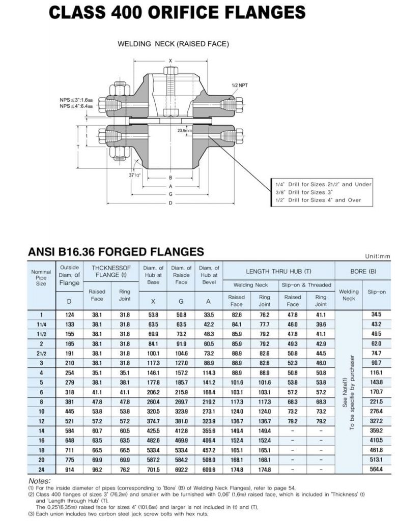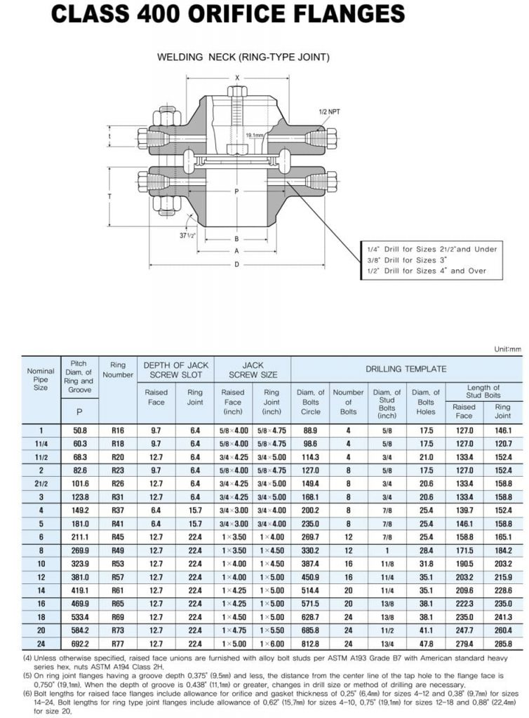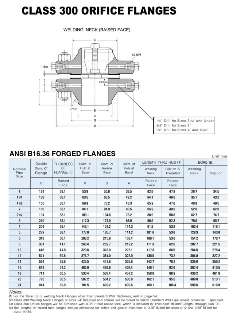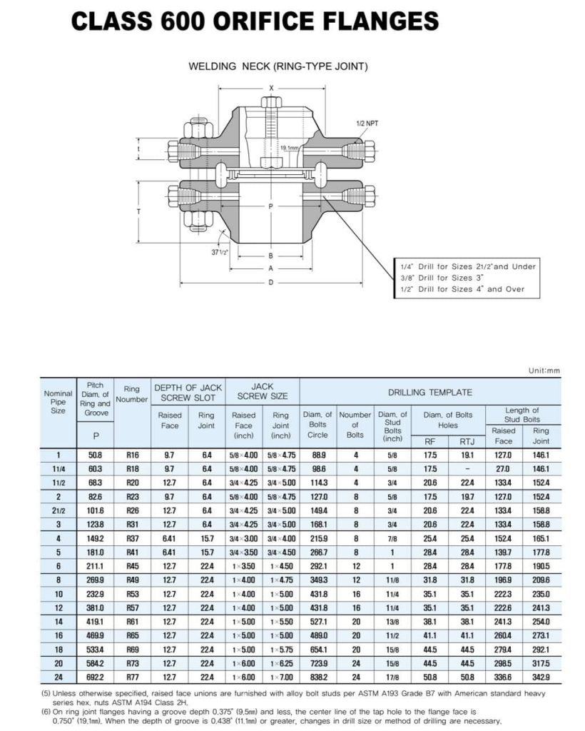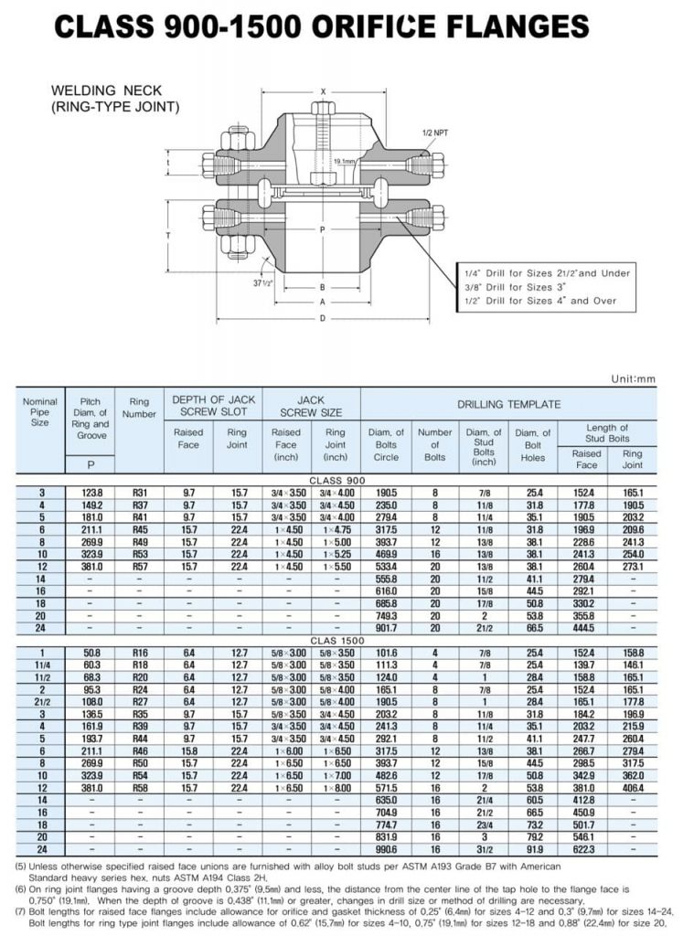 Orifice Flanges are used with orifice meters for the purpose of measuring the flow rate of either liquids or gases in the respective pipeline. Pairs of pressure “Tapping”, mostly on 2 sides, directly opposite each other, are machined into the orifice flange. This makes separate orifice carriers or tapping in the pipe wall unnecessary. Orifice Flanges generally come with either Raised Faces or RTJ (Ring Type Joint) facings. They are, for all intensive purposes, the same as weld neck and slip on flanges with extra machining.
