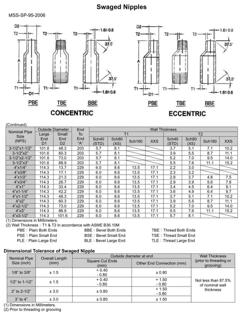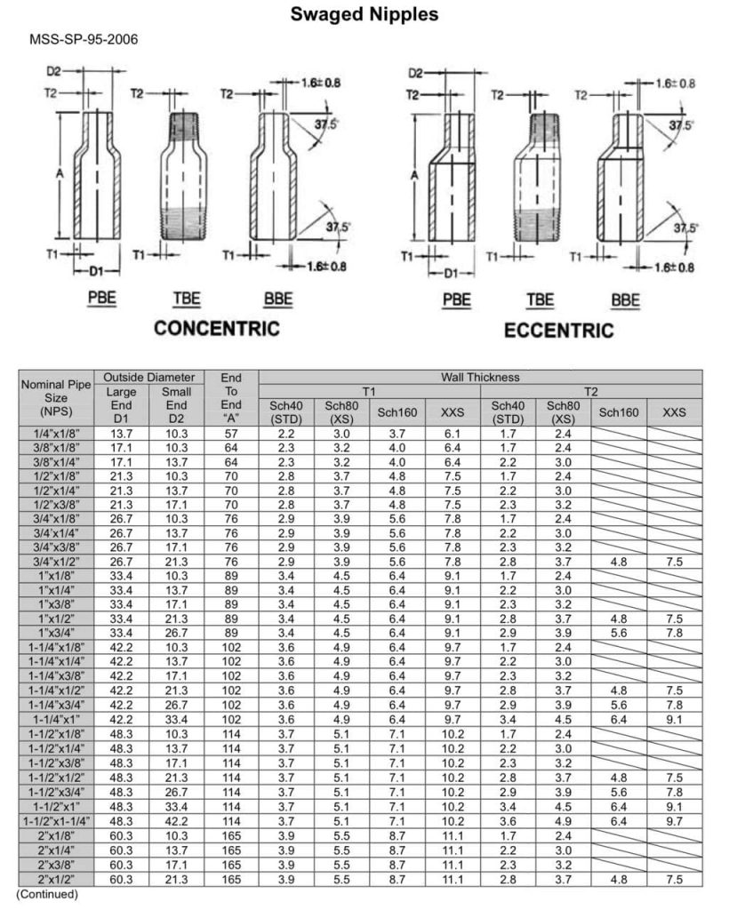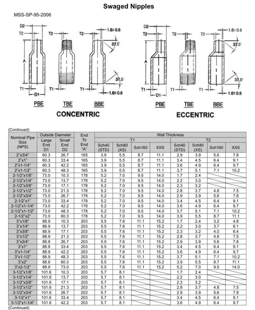 A swage nipple is something similar to that of a reducer but it is used to join the butt welded pipe with a socket welded or screwed pipe.Like the reducer,swage nipple is also available with two variations:concentric swage nipple and eccentric swage nipple.The swage nipple generally adopts the MSS SP-95 or the BS3799 Standard.